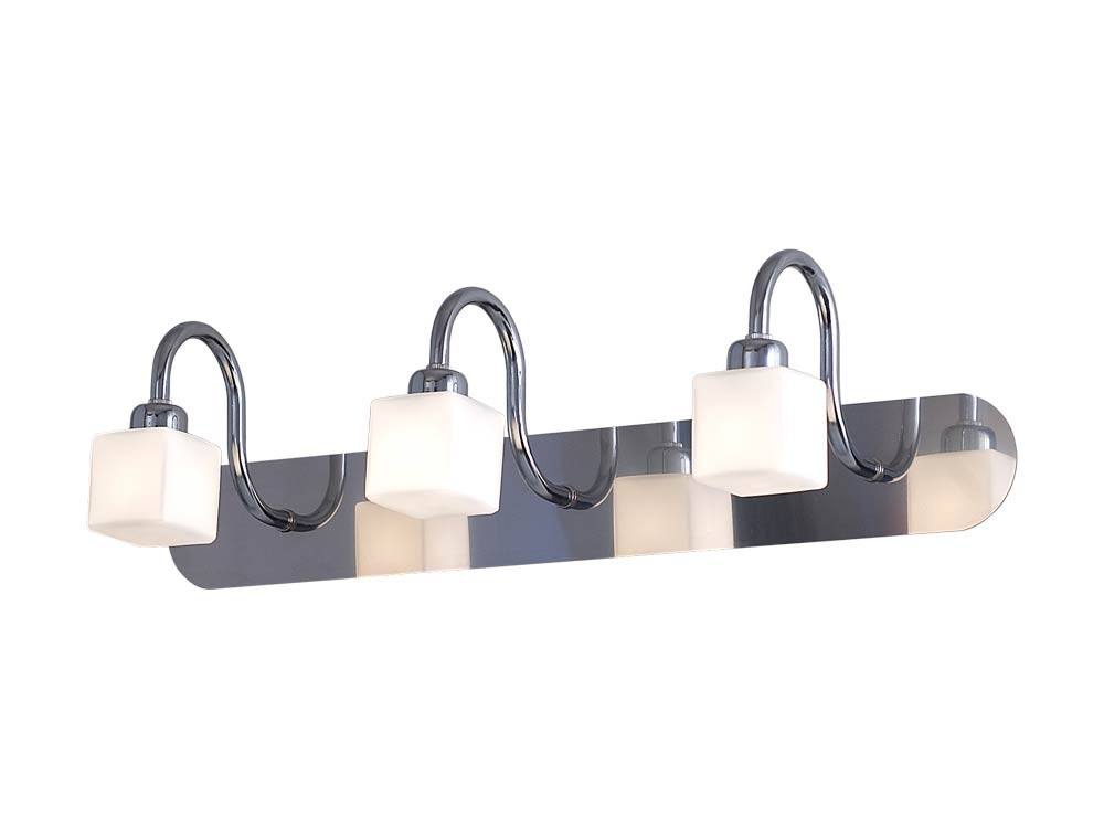 Аплик Bolo с 3 лампи.Подходящи за над огледало в баня или друго помещение. Огледален хром и инокс. Бели кубични стъкла._x000D_