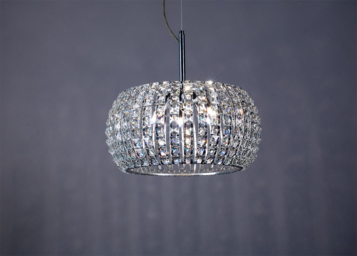 Кристално осветително тяло Venus 6x40W G9. Малки халогенни лампи обградени от кристални орнаменти, полиран огледален хром. Регулируема височина на стоманена корда._x000D_