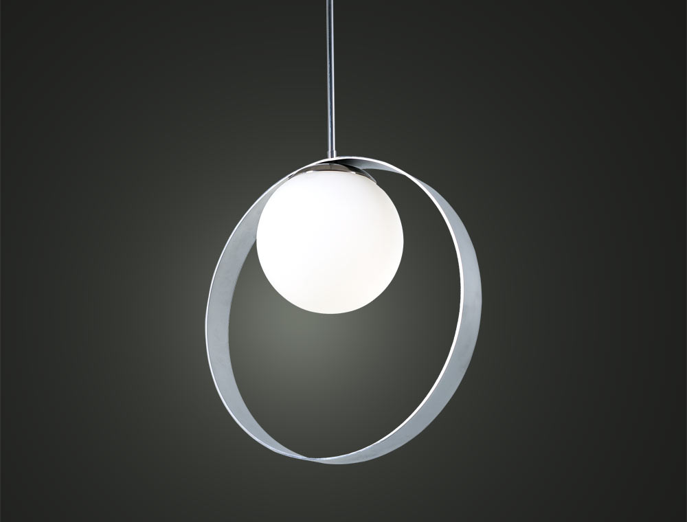 Осветително тяло Waldes. Матиран хром и стъклен бял глобус. Изчистен модерен и стилен дизайн. Предлага се в три размера – ф400, ф500 и ф600 мм. Подходящи за комбинация от посочените три размера. Височина на спускане от тавана – според изискванията на клиента. Възможност за използване на енергоспестяваща или светодиодна лампа в глобуса. Забележка: посочената цена е за диаметър 400 мм._x000D_