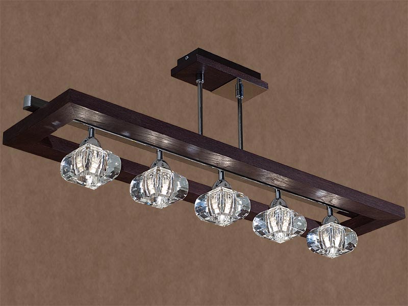 Плафониера Caramel 05 с пет лампи, кристал и модерен дизайн. Цвета на осветителното тяло е венге / череша и хром. Подходяща е за помещения с модерен интериор. Съчетание на дърво и кристал. На снимката е показан вариант с късо рамо, може да бъде и с телескопично рамо._x000D_