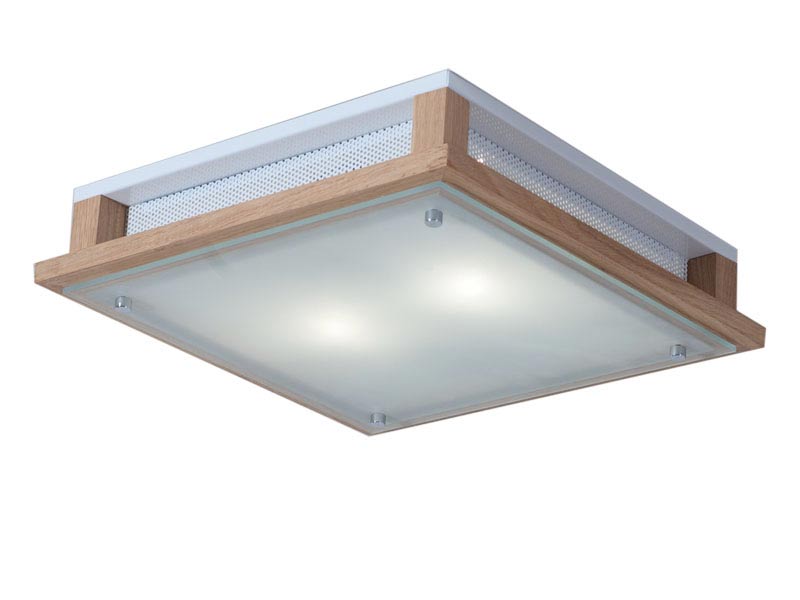 Плафониера Mood с две енергоспестяващи крушки. Модерен квадратен дизайн и декоративнa рамка от дърво в цвят естествен дъб. Подходяща за помещения с ниски тавани. Лампите не са включени в комплекта._x000D_
