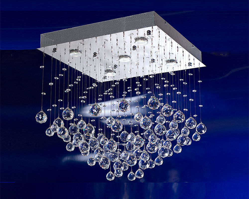Плафониера Tea 05 Crystal inox с пет лампи, кристал и модерен дизайн. Съчетание от кристал и огледален инокс. Подходяща е за помещения с модерен интериор. Лампи GU10 с насочена светлина за акцентно осветление на кристалите._x000D_