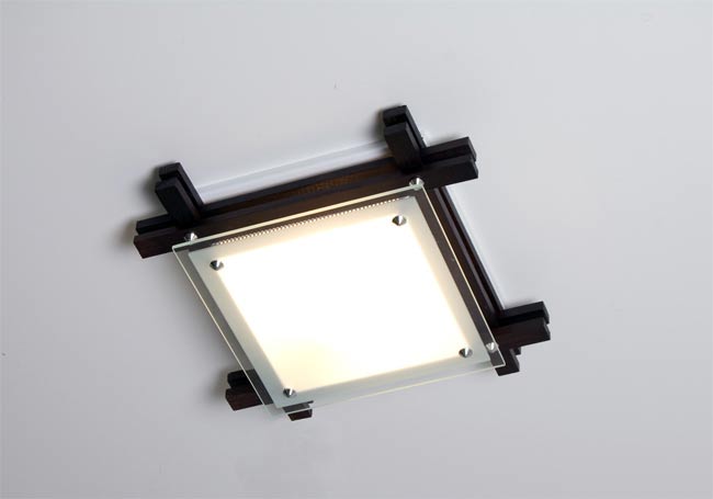 Плафониера Wood с една енергоспестяваща крушка. Модерен квадратен дизайн и декоративни елементи от дърво в цвят венге. Подходяща за помещения с ниски тавани. Лампите не са включени в комплекта._x000D_