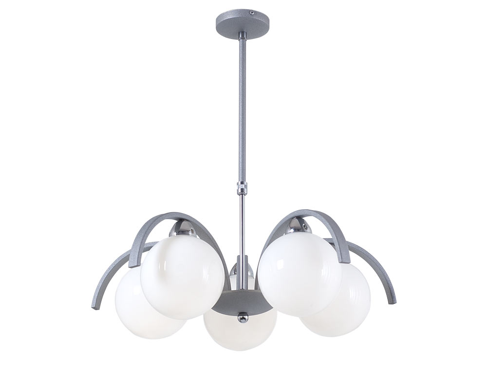Полилей Globo 05V. Осветително тяло с рамена във формата на арка, снежно бели стъклени глобуси и хромирани елементи._x000D_