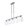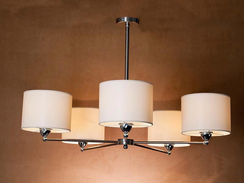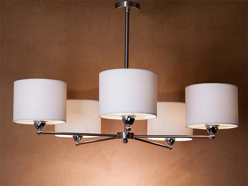 Полилей с пет бели абажура. Изчистен и модерен дизайн. Предлага се в три цвята на арматурата – инокс, титан, хром и няколко цвята абажури – бял, черен,сив, екрю, бордо. Лампите не са включени в цената.