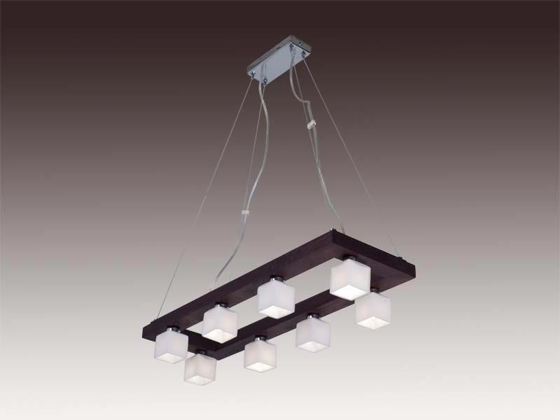 Полилей Lola с 08 лампи. Декоративна дървена рамка в цвят венге или череша. Малки опал стъкла с халогенни крушки. Окачване на метални корди позволяващи регулиране на височината._x000D_