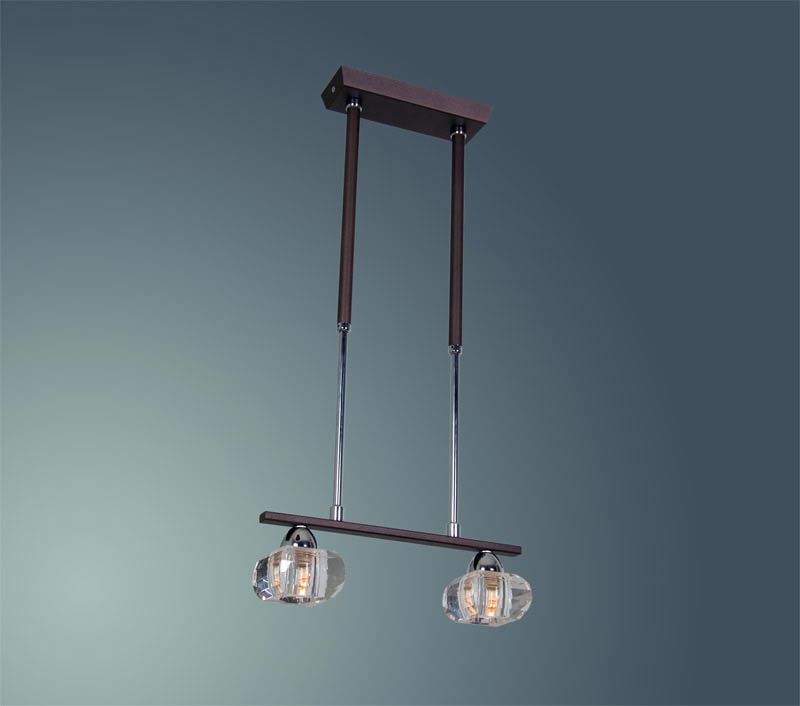 Полилей Sparta KR 02 с две лампи, кристал и модерен дизайн. Цвета на осветителното тяло е венге и хром. Подходяща е за помещения с модерен интериор. Съчетанието на огледални повърхности и прозрачен кристал създава усещане за стил._x000D_